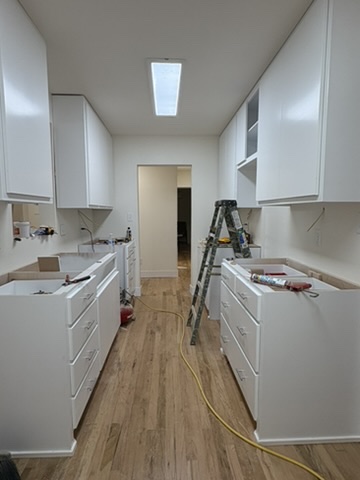 It seems to be moving fairly quickly now. We need to install both shower doors before proceeding with the sink in the main bathroom and the toilet/over toilet cabinet in the 2nd bathroom. We also need a little more flooring to finish the closet floor in the 2nd bathroom. The baseboards and door trim throughout the house need to be taped and painted, hot water heater needs to be installed, dishwasher needs to be purchased and installed, ceiling fans installed, vanity lights and mirrors installed in bathrooms, back door replaced, utility room window replaced, utility room cabinets painted, doors re-installed after trim painted, undercabinet lights installed in kitchen, sidewalks poured, etc. so there's still some stuff to do.